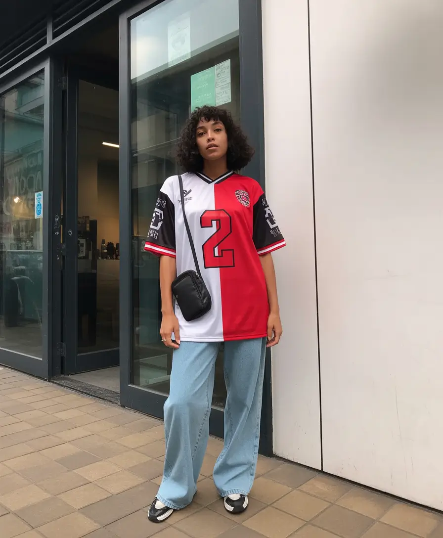 Who would have thought that an old-school soccer jersey would be this runway-ready? The color block of red and white is a heartbeat, it is modern and nostalgic at the same time. Together with loose jeans and smooth black and white shoes, this is a balance of laid-back and impressive. It is the type of Black women street-style clothing that makes your daily routine sporty yet not sloppy.