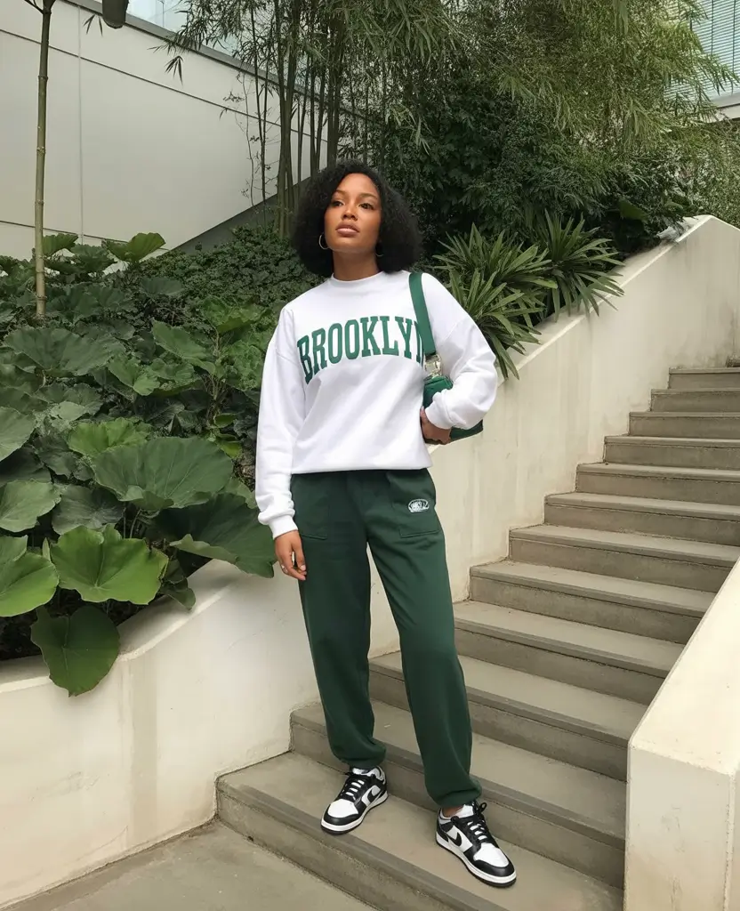 Certain attire speak of self-confidence; this one sings it. It is a sharp white sweatshirt with a printed Brooklyn in collegiate green and a matching track suit, it is the simplicity that works. I have always gravitated towards black and white sets as there is deliberate intent. This is that one that fits well in casual outfits of the black women, and it is cozy and fancy enough to wear on weekends but fancy enough to wear on brunch.