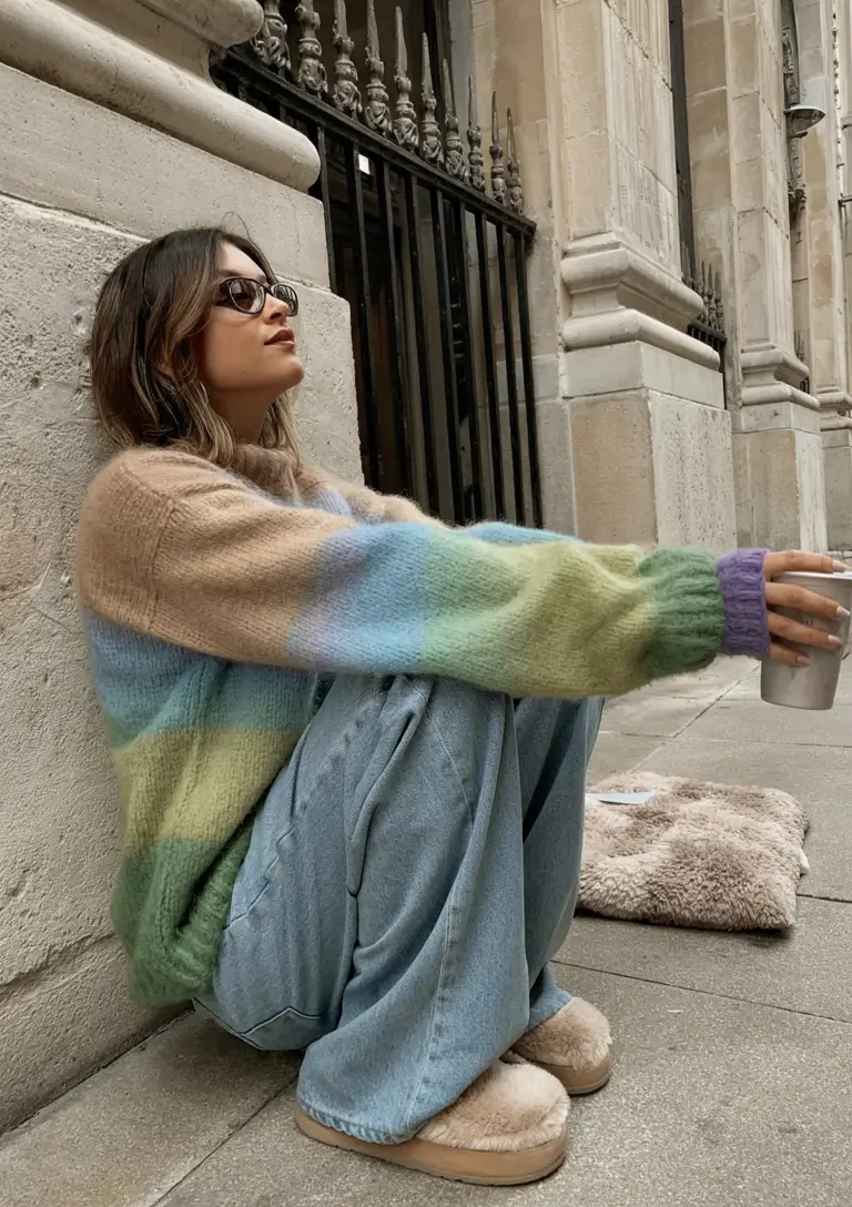 Soft gradient stripes have a certain allure, in particular, when the colors blend with one another as morning sunlight. There is that fluffy finish on this knit, and it is very loosely fitting on the skin, making it seem like a trendy sweat sweater that I’ve always wanted but would not want to spend a significant sum of money to buy. Wide denim bases the appearance, which provides the entire figure with a light-weight yet purposeful balance.