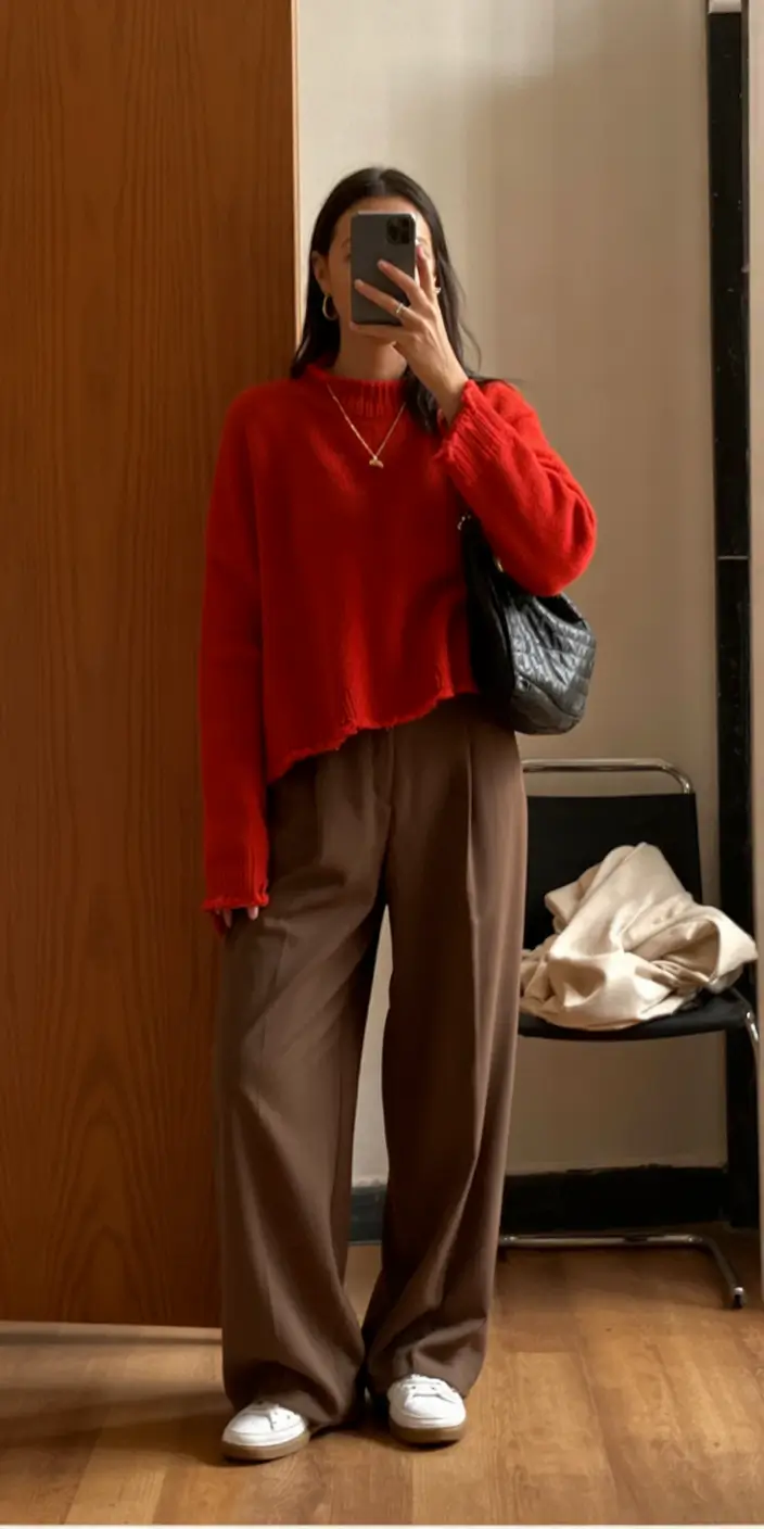 Power move is always present with the help of a bright red knit, which is combined with light brown pants and old-fashioned white sneakers. It is daring yet comfortable, just the type of vigor that defines fashionable sweater is what women will be gravitating towards in 2026. The slightly cut texturised bottom part makes the entire appearance feel fresh with its rough and contemporary appearance.