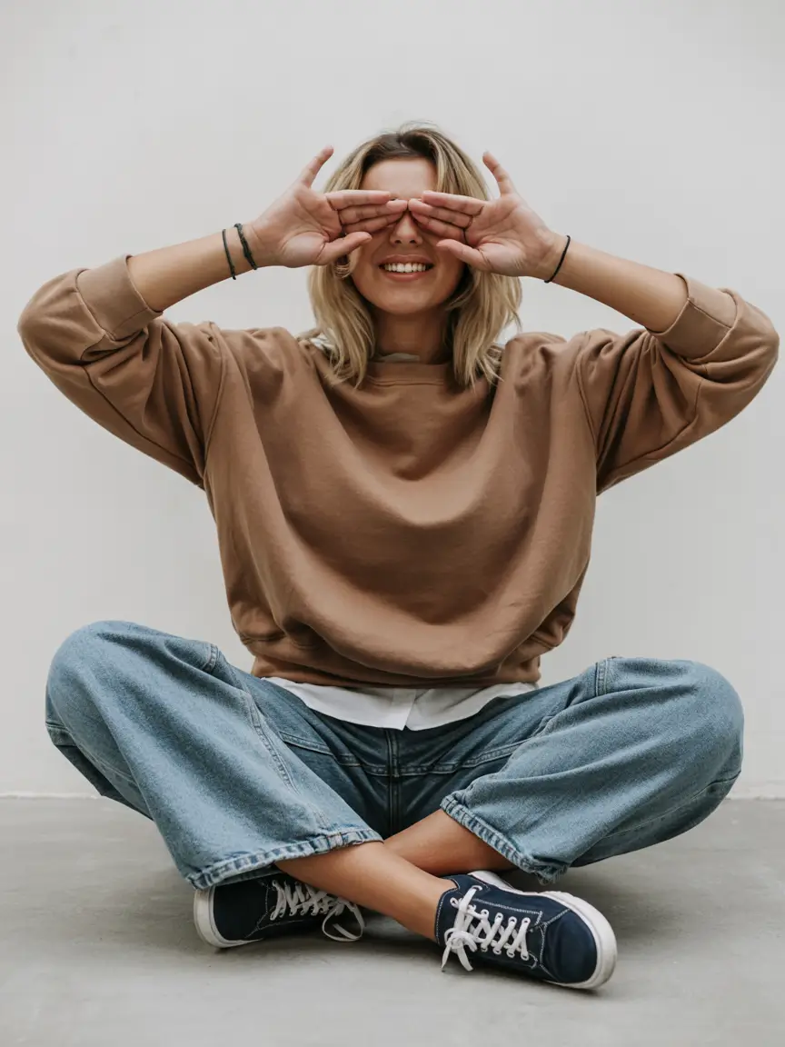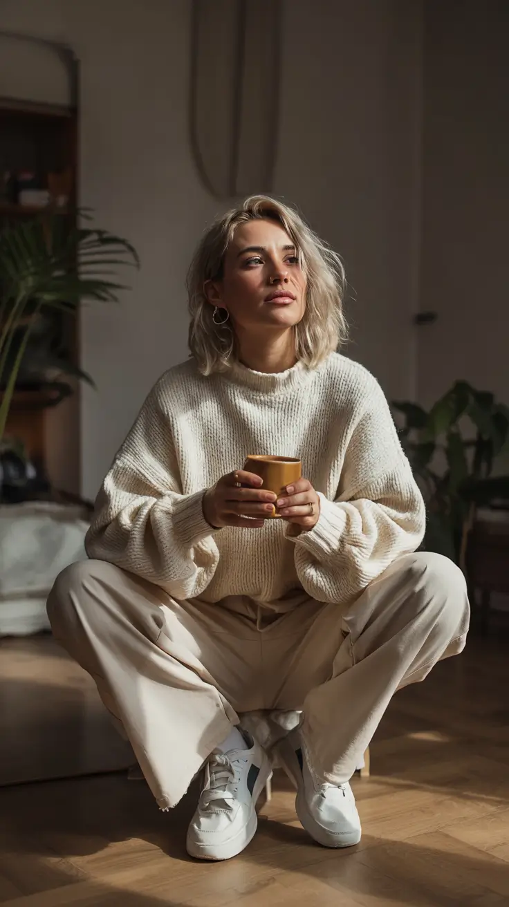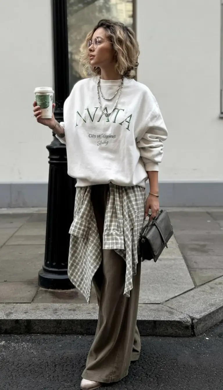 Something that is so utterly cute about the combination of soft neutrals here is that it occurs. The large cream sweatshirt provides a loose and casual look, and the small writing is sufficient to add details but not to distract the very simple color scheme. This outfit, with roomy and loose trousers and a checked shirt that is knotted at the waist, captures that nonchalant, slightly unkempt style that defines stylish clothing in 2026 with sweater. It has a sense of the ideal combination of city functionality and easy comfort, the type of clothes I would wear when going on a cool morning run to have a cup of coffee.