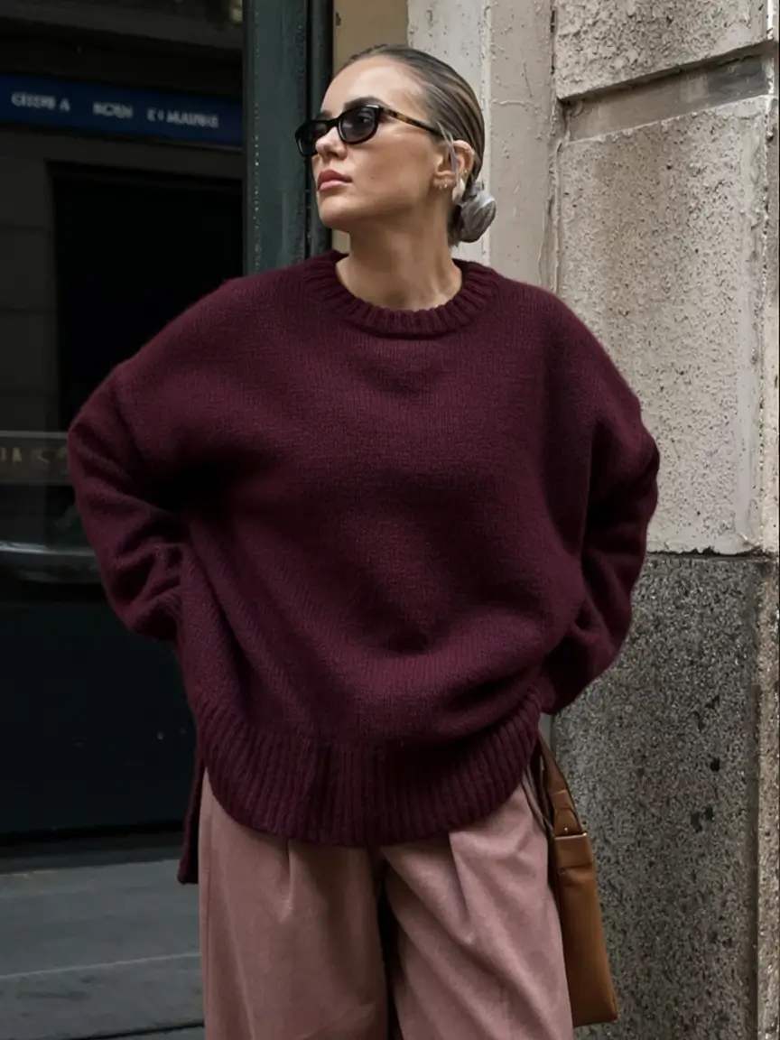 There is something so beautiful about deep burgundy, how it can make one feel elegant without being strict at all, and in an oversized knit, it becomes a whole statement. The appearance also capitalizes on the essence of the stylish sweater that women are currently obsessed with: loose-fitting, cozy materials, and some attitude. The casual fit is combined with loose pinkish-beige trousers that make me irresistible to the tonal harmony. It is very little yet sweet and touching.