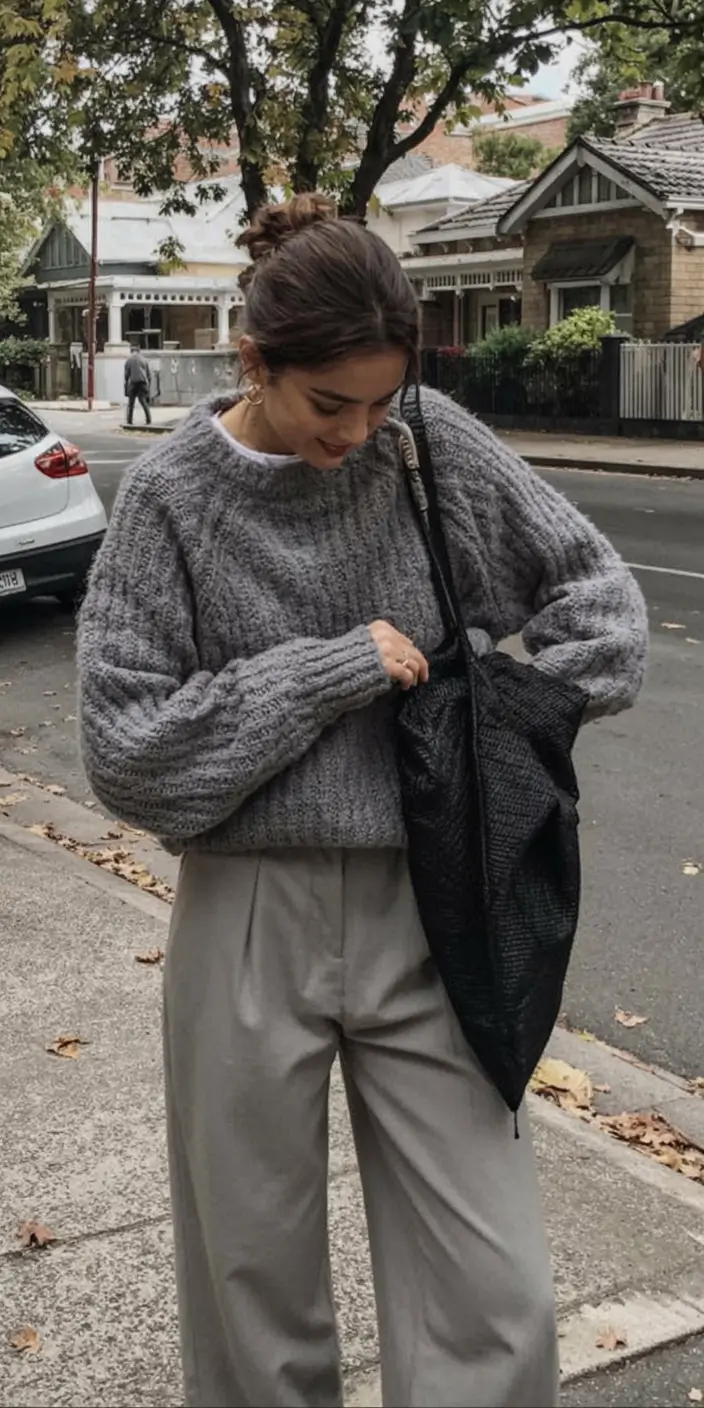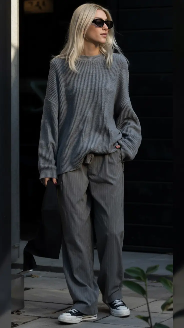 Head-to-toe grey does not need to be flat – and this outfit can confirm it. The heather-grey sweater is huge, and sits well over the loose pinstripe, producing a combination of softness and discreet tailoring that seems to be incongruent. That is what this type of clothing should resemble trendy winter sweater outfits the least flashy, but stylish. The use of black and white palette makes everything seems to be unified, whereas the textures prevent everything to be visual stale.