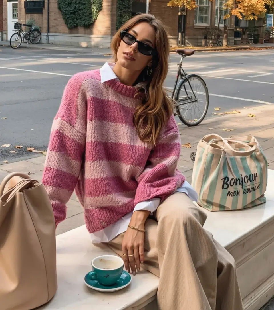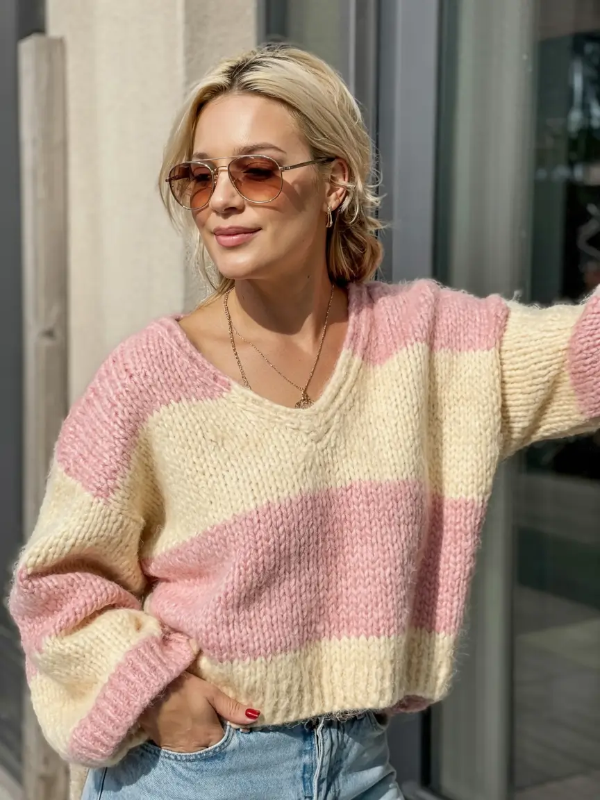 Something old fashioned about wide pastel stripes, when they are adorned with light denim and soft accessories. This striped sweater is warm, jovial and purposefully casual the sort of sweater that grounds trendy knitted sweater outfits when you want cozy fabrics to combat soft background lights and casual weekends. I adore the way the big knit is worn which seemed like it was crafted to be worn in slow mornings and breezy weather. The beige colors mixed with blush pink are very feminine and sweet without making the perspective too playful.