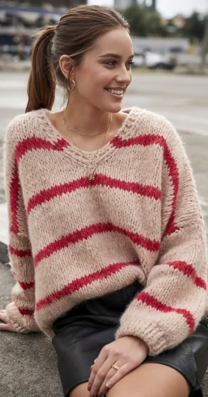 Had I been doing this on myself, I may have included high suede shoes or even white sneakers to go on a typical day out. Red stripes already contribute enough personality to the work, so all the rest can remain minimalistic. It is an excellent way of showing how bright color can be introduced to the fashionable sweater that does not take over the wardrobe.