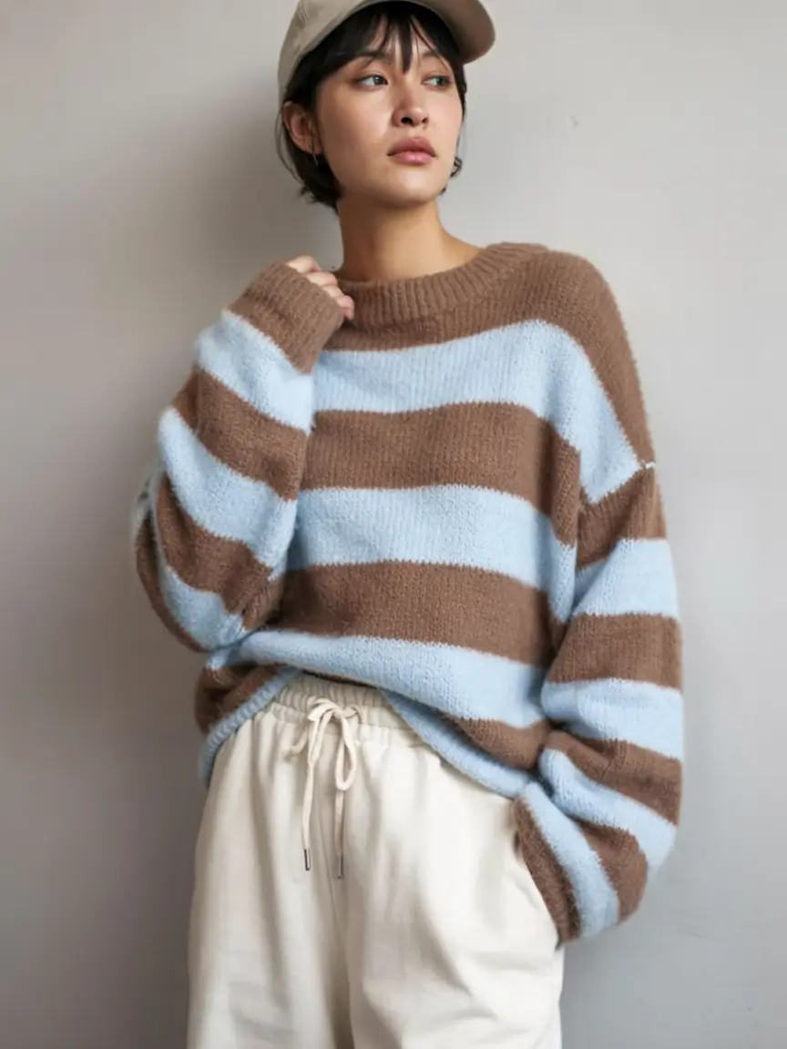 Softly shaded caramel, warm beige, easy brown, the palette created by these stripes makes me instantly think of the fall leaves and early-morning walks. This sweater has a warm appeal, which can be used in fashionable fall sweaters, particularly with loose jeans and big sneakers. The informal overlay with a white shirt under makes it all fresh and friendly.