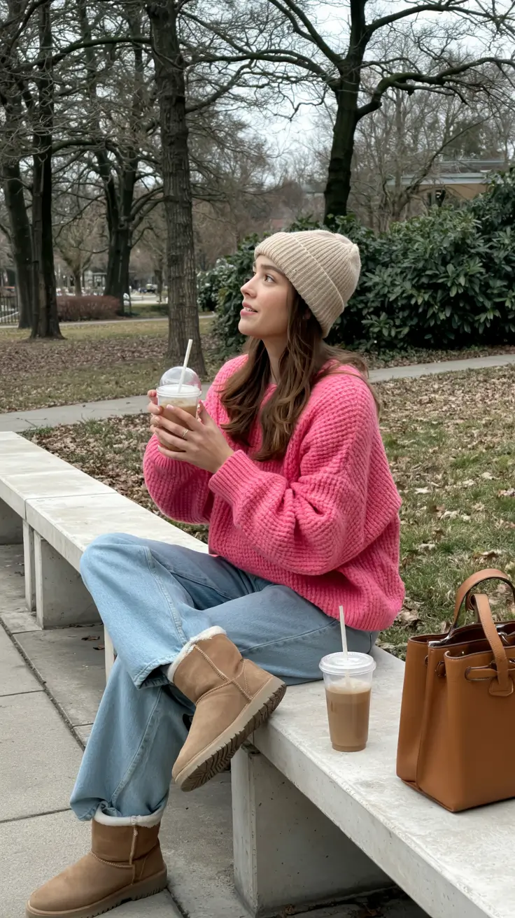 The loosel fit is best paired with wide-leg denim, which gives it a relaxed look that is not inattentional. Ugg-type shoes provide the coziness and the warm winter-spreading feel which makes the winter less frightening. I have always thought that even casual apparel may be stylish, given the proper palette, and this outfit is just that. The harmony of the rosy knit and the natural outdoor location is there- it almost makes one feel that they are reminding one that winter does not necessarily have to be colorless.