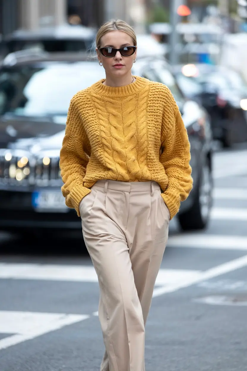 The cozy mustard cable-knit immediately creates the sense of confidence – the type of outfit I turn to when the day is hectic but I want to feel comfortable. The combination of the texture and construction is just so beautiful here: the baggy sweater balances the hard edges of the fitted beige pants and the whole outfit is that I just woke up and look like I dressed well vibe. And, frankly, the mixes such as this have always made me think of why the fall outfits favorite with women tend to center around an eye-catching sweater.