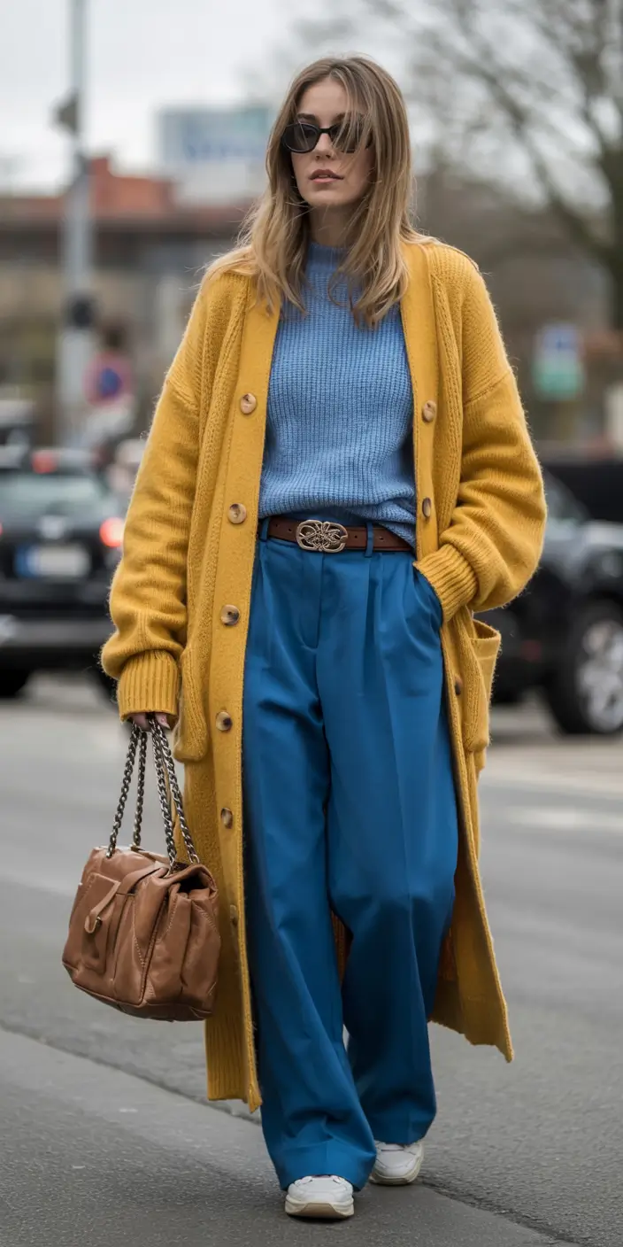 It is magical to have saturated mustard with cool blue, especially when the latter appears in cozy knits as well. The long cardigan encircles the appearance as a warm coat of sunshine, whereas the gentle blue sweater under it provides a soothing contrast. It is the type of outfit that I would gravitate towards on days when I need my mood boosted – why not have your clothes uplift your morning run to the coffee shop?