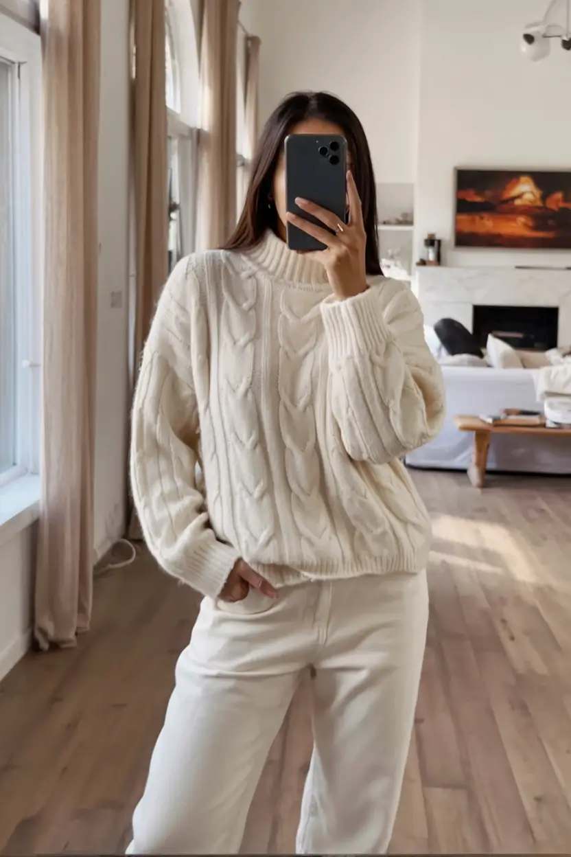 White outfits are the best things to wear when one needs a fresh breath and this textured cream sweater and matching denim is just that. The cable-knit is subtle and does not overshadow the outfit, and the high neckline provides it with a clean timeless appearance. I am a fan of the way things are more costly in monochrome — even simple things become styled.