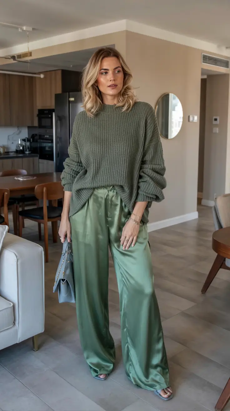 The combination of a ribbed olive sweater and fluid satin pants is so lovely of an opposing match matte and shiny, cozy and elegant. I love this type of mix as it provides knitwear with a new tone and it is no longer on the casual side, but rather evening-appropriate. It is a fantastic illustration of fashionable costumes with sweater that seem to be fresh and modern.