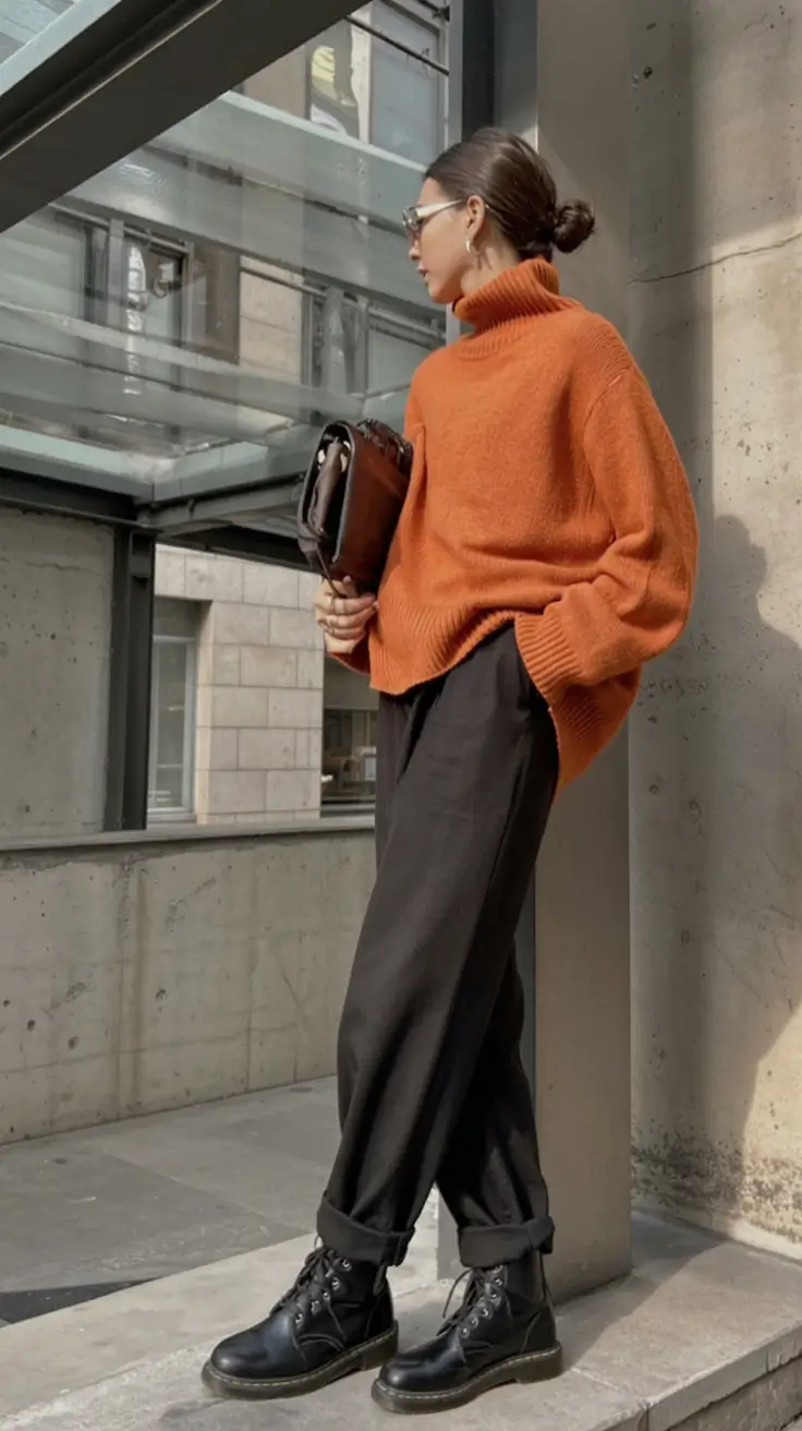 Something about this loose burnt-orange turtleneck is so irrepressibly sure. It is the type of sweater that you put on when you need some immediate energy like the color itself provides you with some internal energy. I am fond of the way the coziness of the knit contrasts the coldness of the environment the setting is in around her. The trousers are black, and the shoes are robust lace ups, which give the impression of a down to earth, urban chic that makes the entire appearance practical and very eye-catching. This is precisely why fashionable women sweater clothes need not necessarily be soft, sometimes they can bite.