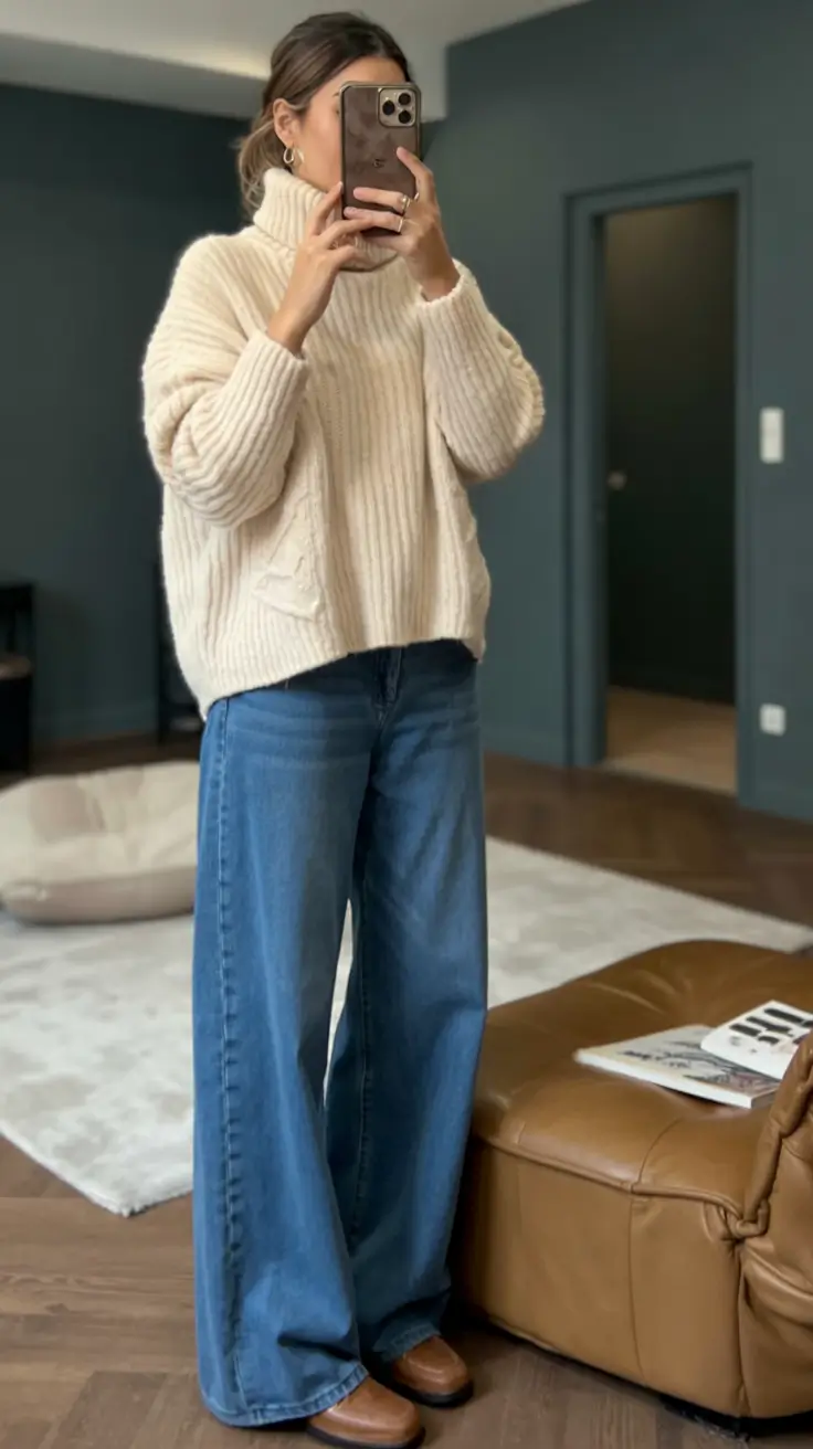 This cream turtleneck and casual wide-leg jeans are what the modern classics entail. The sweater appears plush and garmented with a certain degree of architectural appearance in the manner it maintains shape. And denim makes the whole thing and makes it so laid back and everyday that I always go to it when I cannot decide where to wear to. Frankly speaking, this is one of the reasons why sweater and jeans looks will never become old-fashioned.