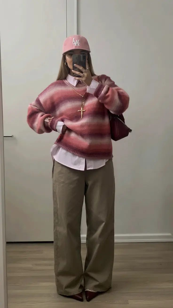 Stripes of warm pink are sure to make one feel a bit happier and this knit provides it to the most civilized manner. Combined with light beige trousers and a fresh-collared underlay, the entire outfit seems like an idyllic coffee morning – casual, beautiful, and warm. That is precisely what makes trendy sweater outfits so irresistible that are both feminine but not girly, cozy yet not sloppy.
