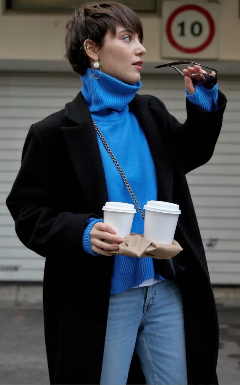 The refreshing quality of this electric-blue turtleneck is something incredible. It illuminates the whole outfit, in fact, the whole street around her. Complemented with a long black coat and standard denim, the color is the focus, which adds just the right amount of pop without being obtrusive. It is the kind of clothing that you wear when you want your sweater to speak all the words.
