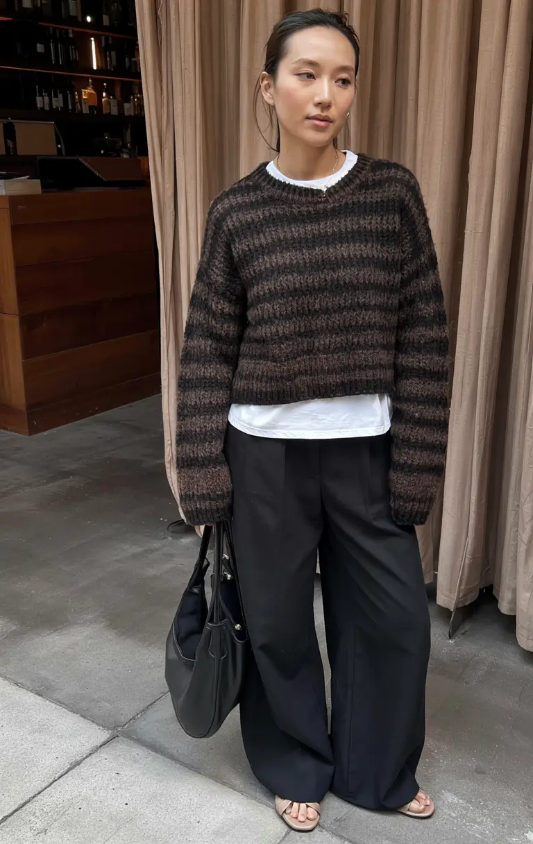 Quietness in brown muted stripes is quite sophisticated, particularly when there is a clean layer of white showing at the bottom. This knit is light and heavy at the same time and forms one of those cool knitted sweater outfits that is both soft and part structured. I prefer the loose structure in juxtaposition with the refined black trousers that create a loose rhythm to the outfit.