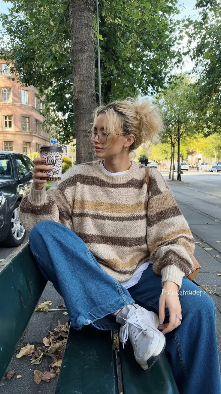 I am a fan of such outfits as they are honest. Nothing is obtrusive and the colors are comfortable to the eye, and the shape is oversized, making it ideal in a weekend mood. Stylists in America have observed that stripes are once again taking over the Pinterest not as eye-catching messages but as relaxing backgrounds that are nostalgic and comfortable to wear. This knit strikes this very note.