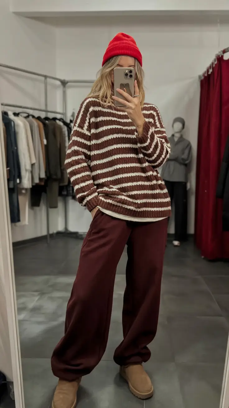 The mix between chocolate and cream stripes is automatically home-like, yet the introduction of a red beanie turns the whole dynamic into the playfulness arena. It is such a cute change of the trendy winter sweater outfits and it shows that dressing in cold weather does not have to be a grayscale. The loose burgundy trousers and tan boots are a great balance to the palette that is warm physically and visually.