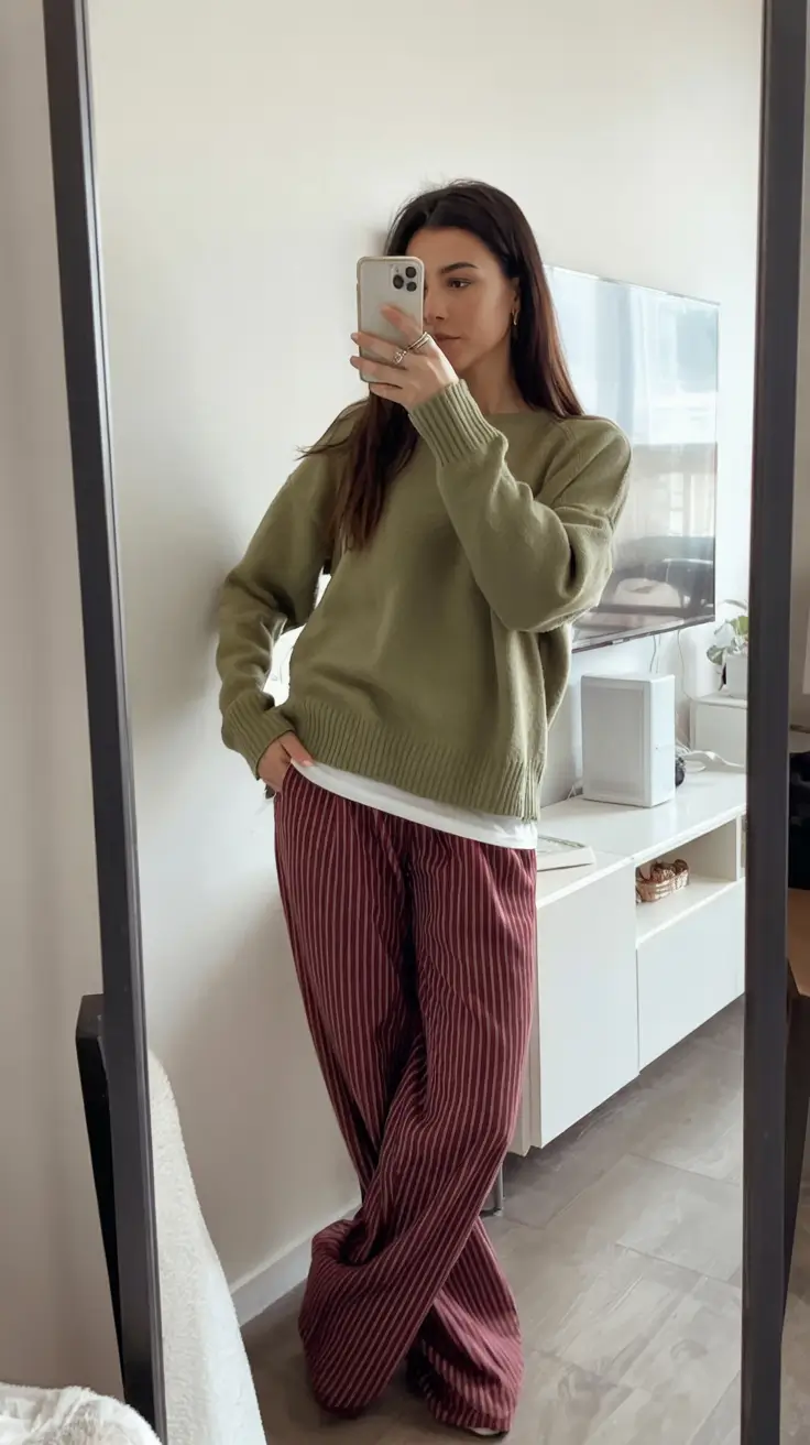 The soft, natural and easy to style muted sage green seems like a breath of fresh air. Combined with striped burgundy trousers, it forms one of those in-fashion outfits with sweater appearance that is loose yet well-considered. This is made more dimensional with the loose cut and plain white underneath to make everything minimal and modern.