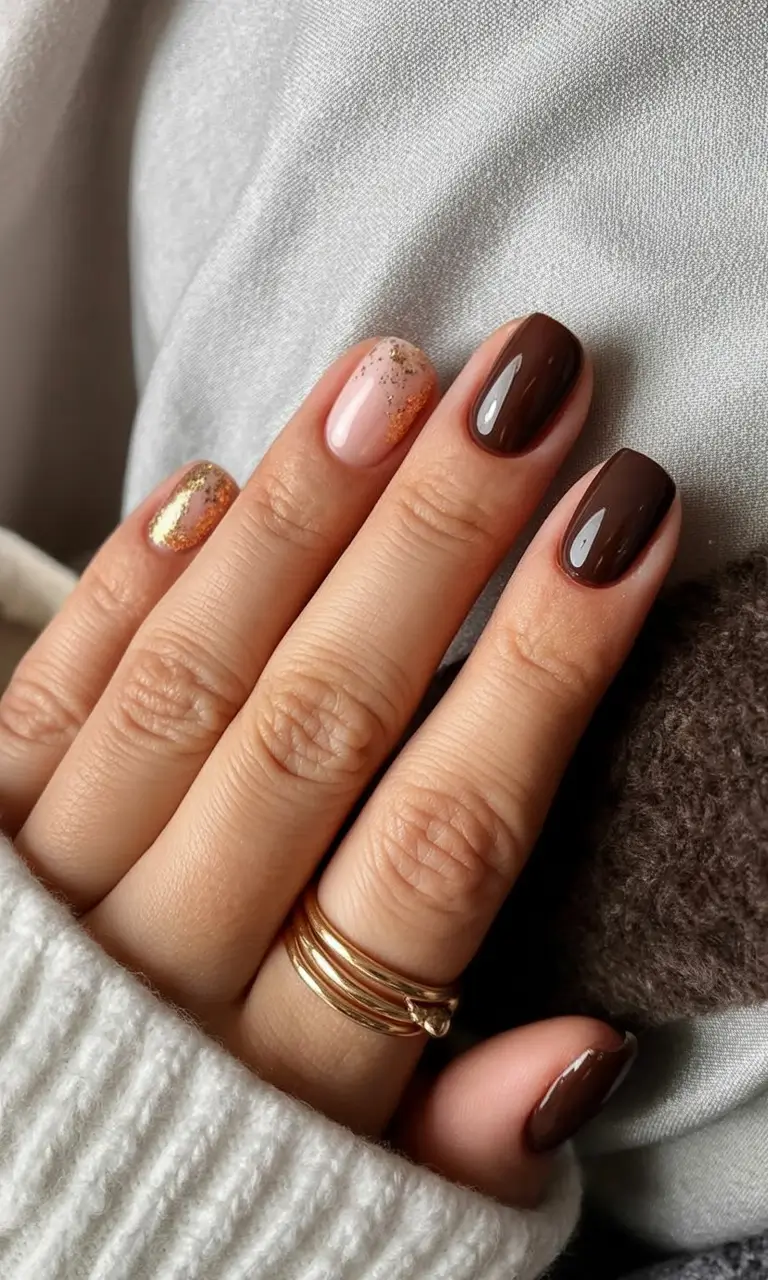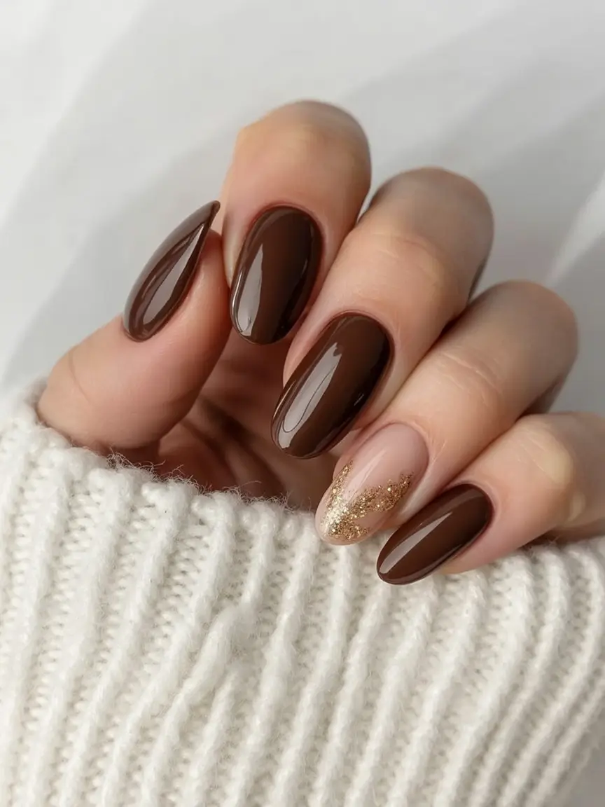 Deep chocolate nails in the wintertime always seem so infinitely fashionable. The shin brown colour is earthy and yet opulent – the cosmetic version of a black velvet jacket. This is how the little golden touch on one nail in the accent causes just enough warmth to play with the light and your manicure is an accessory. This is one of the most modern luxury nail designs that are a simple, warm, and carefree winter color.