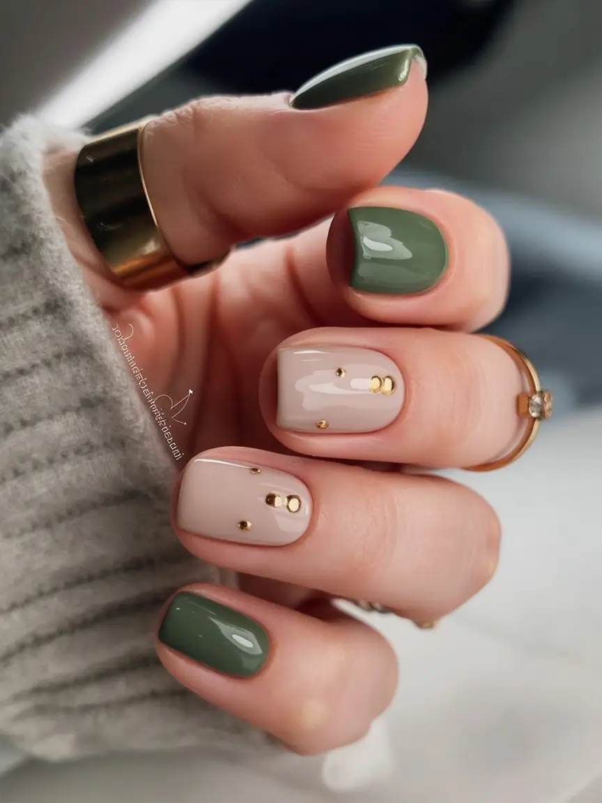 In order to reproduce it, I would begin with Essie Exposed or OPI Olive for Green to provide the down-to-earth colors, and then switch to a nude beige such as OPI Samoan Sand. The gold accents? Micro studs can be applied or a drop of metallic gel polish can be applied with a dotting tool – I happen to love Orly Luxe. Top it with a good coat of finish so that those little touches of gold can remain smooth.