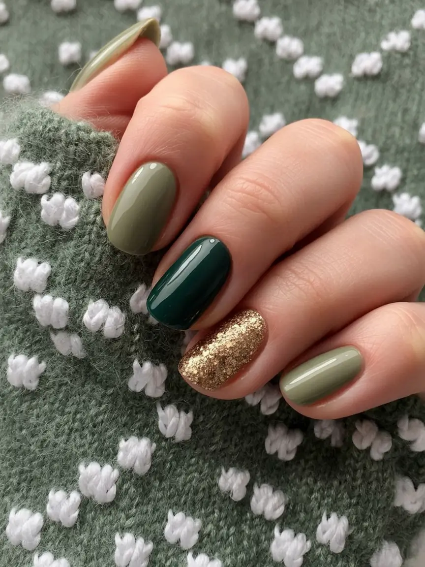 It may be my best mixture of the season soft sage and deep pine, with one touch of gold. It is friendly and comfortable, high-brow, yet ornerous. The tonal greens make the manicure look deep, and the gold provides us with the winter festal shine. It is simply among the most innovative nail designs winter colors trends in 2025-2026.