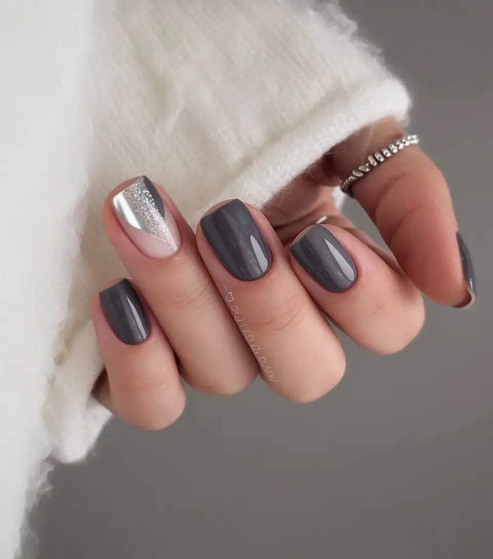This would be the official winter power manicure. Charcoal grey is combined with cold-silver and a touch of glimmer, which creates a sense of a futuristic and very vintage look. This is a high-fashion appearance blunt, smooth and an epitome of winter nail colors and designs.