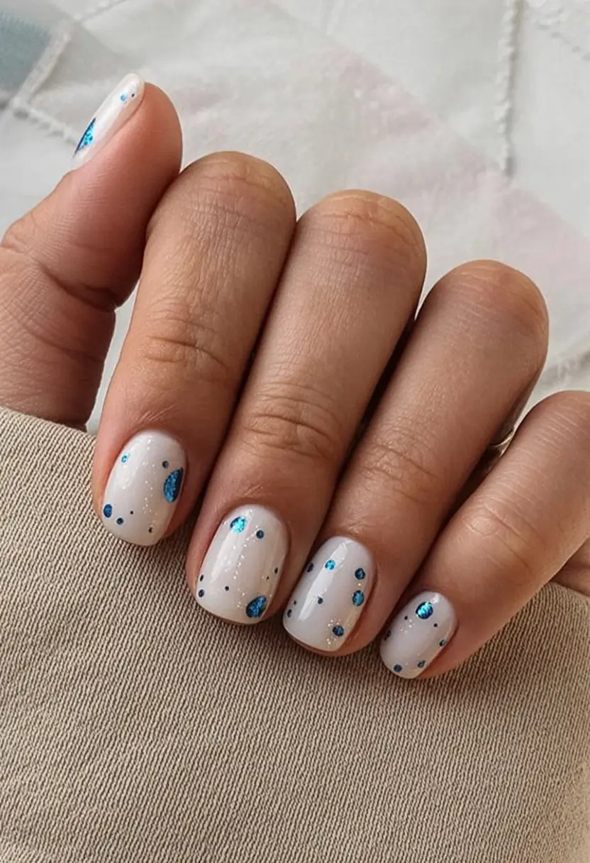 Minimalist nail decorations are still in power and this white base with few dots of blue is the ideal combination of plain and stunning. It is a bit avant-garde, but still friendly-looking, like the snowflakes we sketch on when we are kids, only in an adult version. This design is one of the simple nail designs during winter that do not say much but speak volumes.