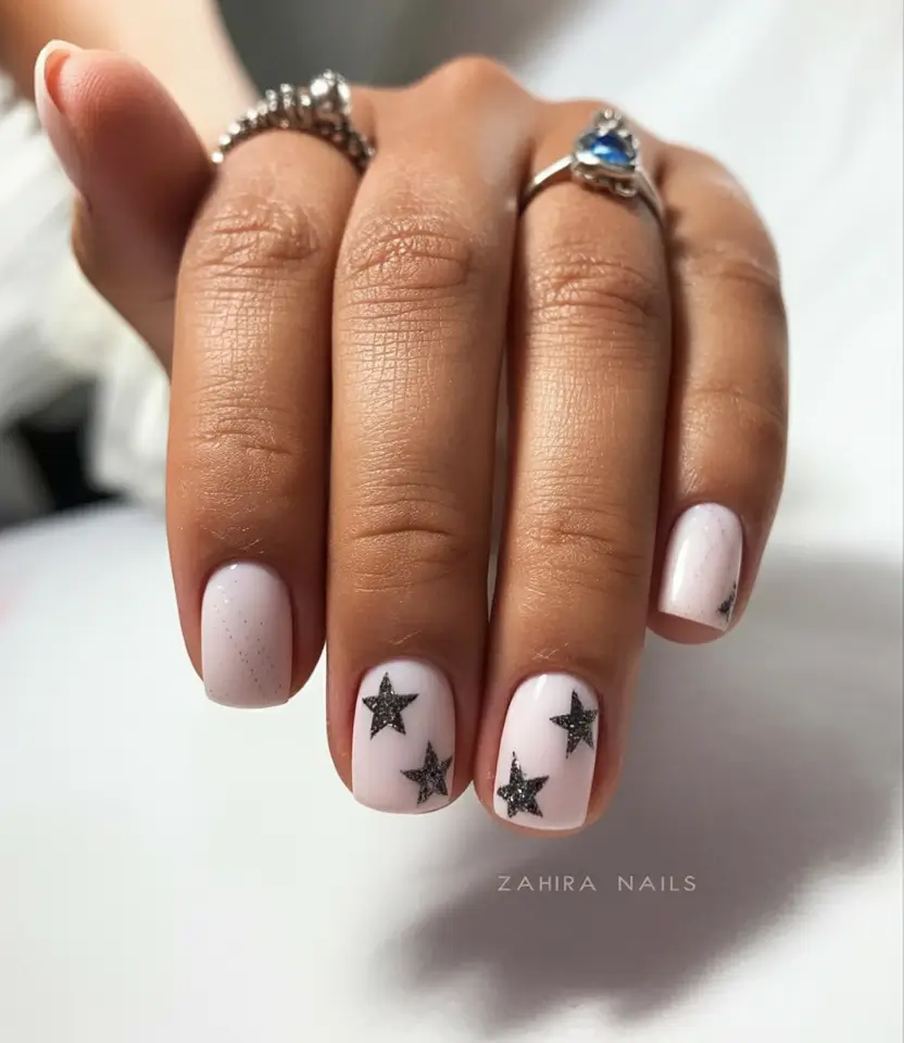 To achieve the appearance, you only need a pale base, such as OPI Funny Bunny or Essie Marshmallow and then hand-paint small black stars with a fine detailing brush or stickers such as Nailtopia. Add a thin layer of shimmer to add dimension.