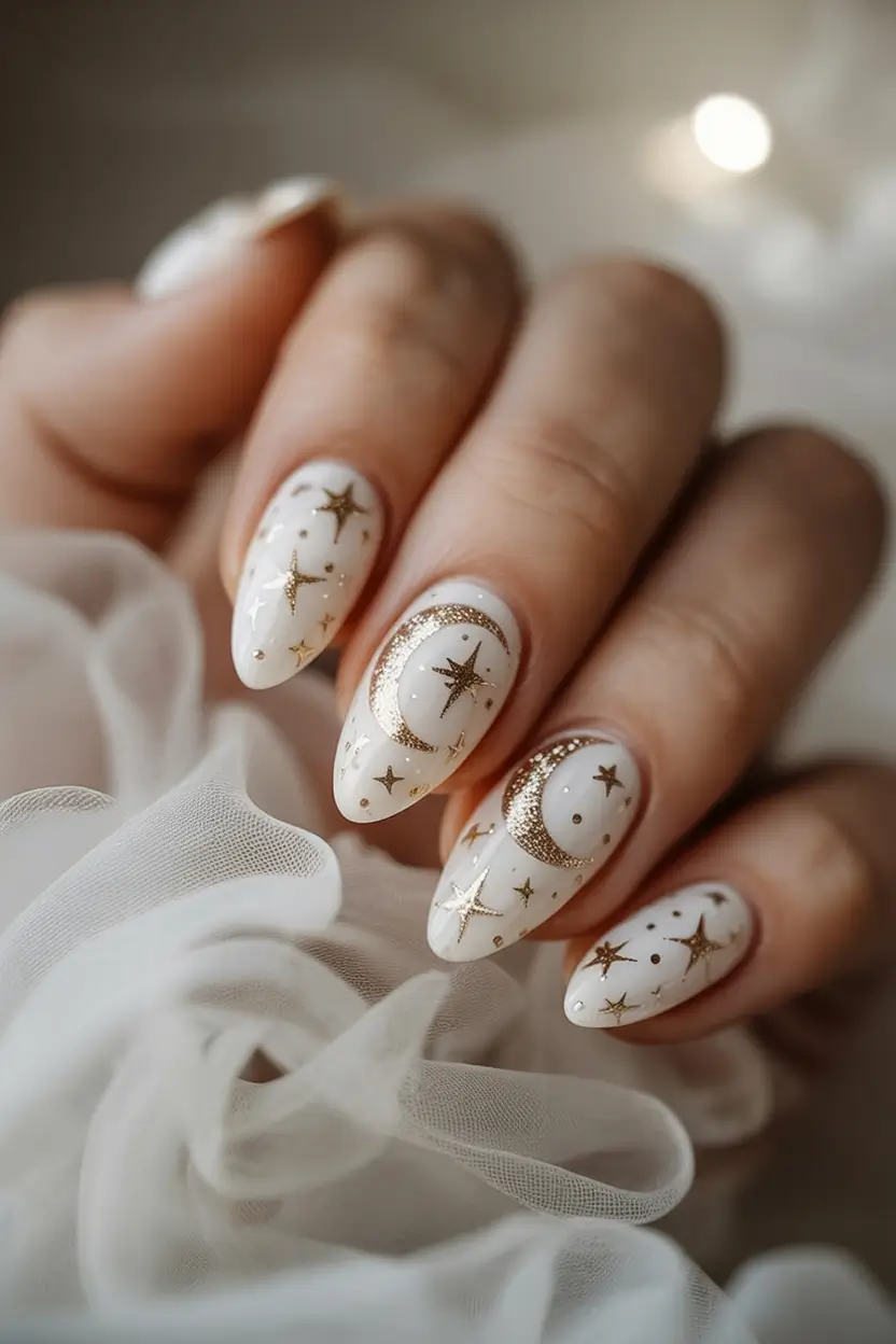 It can be made with Essie Blanc as the base, and OPI Gold Key to the Kingdom or gold foil gel as the detailing. It is all in the laying: the stars close to the cuticles, the moons near the tip, all being covered with a glossy overlay. Being patient, the outcome appears almost hand-painted.