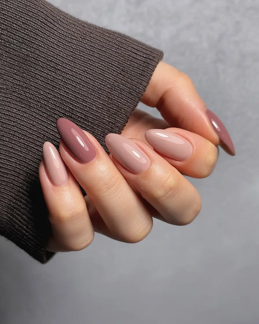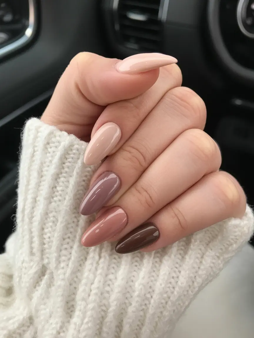 In order to reproduce it, I would select the palette of dull colours such as OPI Bare My Soul, Essie Lady Like, CND Clay Canyon, and OPI That’s What Friends Are Thor. Paint the individual nails with each of the colors to have that smooth light to dark effect. Seal with a glossy gel topcoat to make the gradient jump.