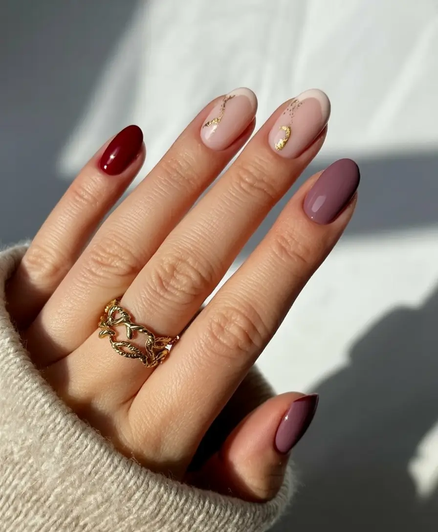 To replicate it, Essie Ballet Slippers with a watered-down version of mauve such as Zoya Rue and gold detailing with a striping brush or foil. Accent nail Finish with a luxurious burgundy color such as OPI Malaga Wine. This manicure has a depth and flavor due to the balance of colors.