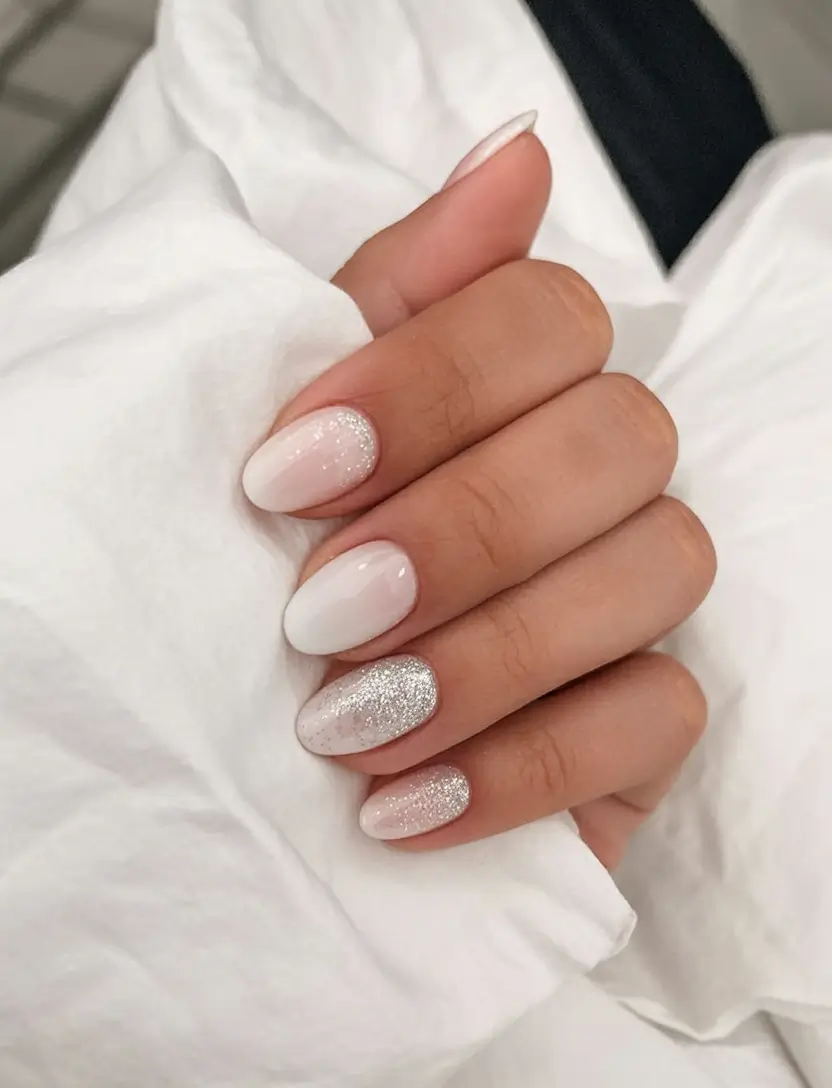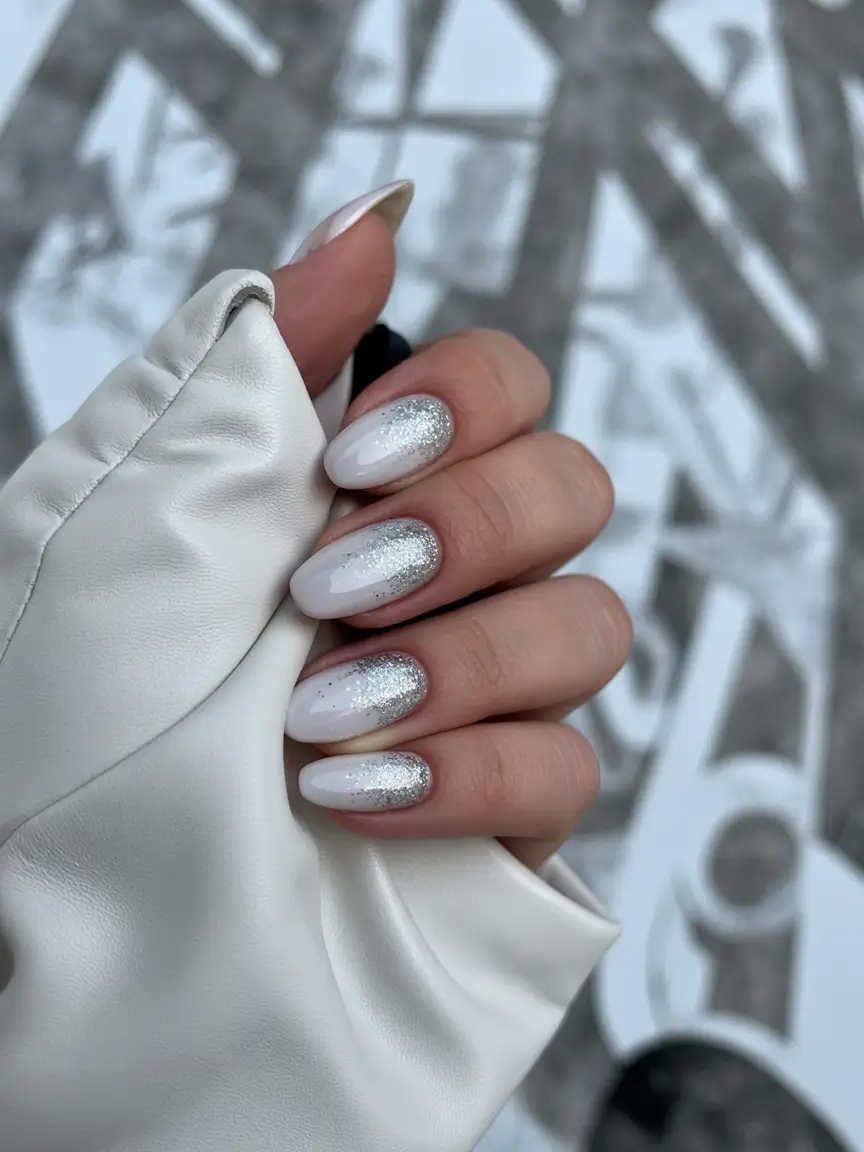 I would use CND Cream Puff or OPI White on white as a foundation followed by a silver glitter such as China Glaze Fairy Dust or ILNP Silver Lining. In order to achieve that gorgeous shed, apply glitter gently with a sponge beginning with the tip and fading towards the bottom. It gives it that gradual effect that is professional yet very possible at home.