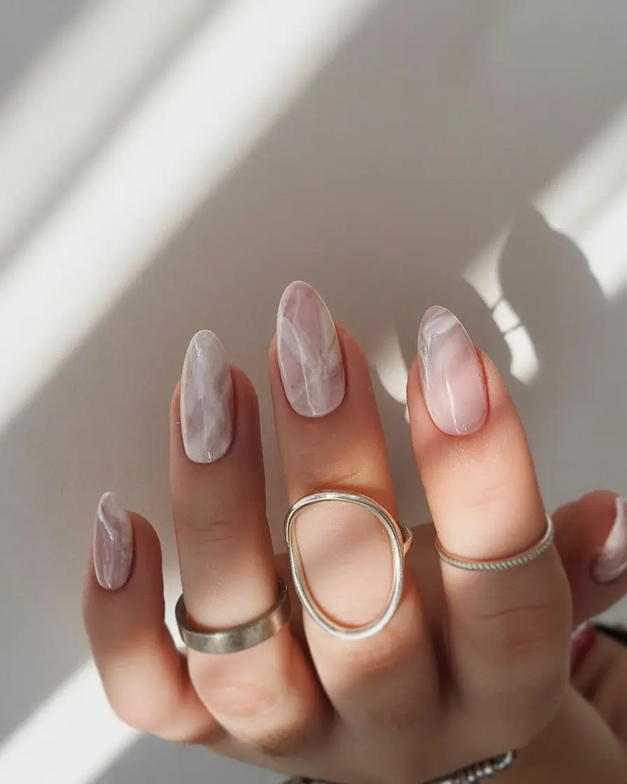 In Allure, celebrity nail artist Julie Kandalec once said that short nails were elongated and made to look elegant with soft marble designs. I can not say otherwise, it makes your fingers stretch. It is the type of manicure which feels hygienic, deliberate and secretly alluring.