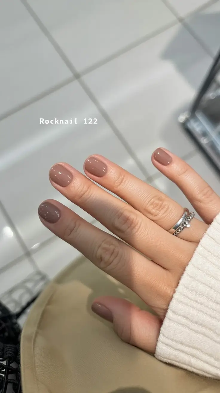 A very nice shade to do this appearance with is Rocknail 122 (seen here): a medium beige with just a slight tint of rosy. Clothing Optional or OPI Taupe-less Beach by Essie is a close dupe in case you desire a salon-quality one. This is made modern with the glossy finish, and the color itself is cozy, almost soft cashmere in polish form.