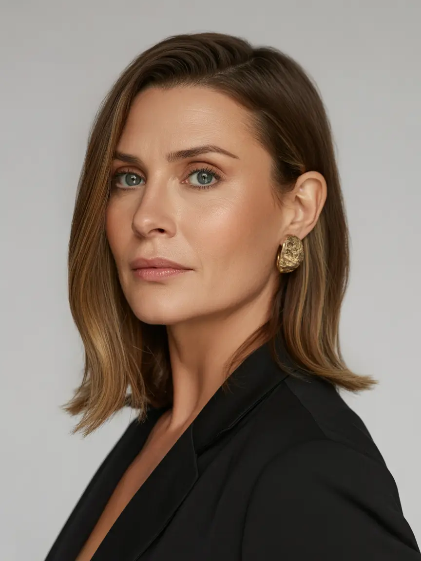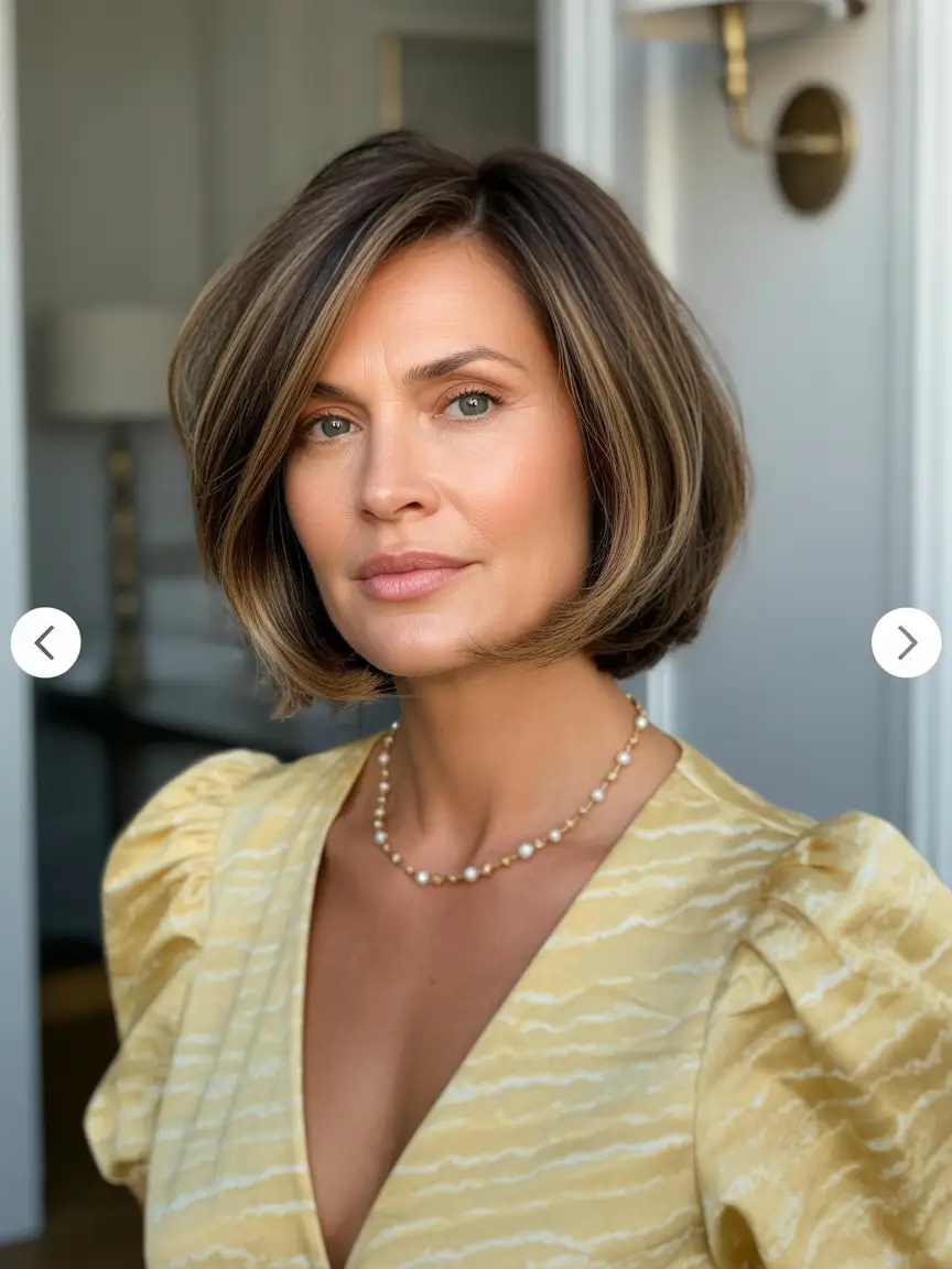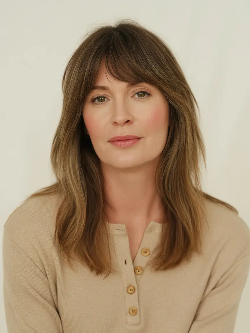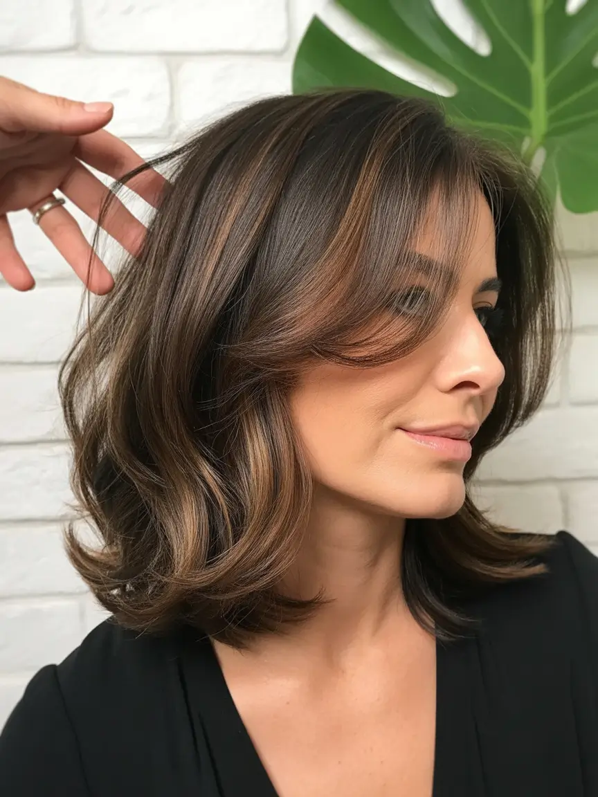 A mid-length cut, which is a combination of soft layers with nuanced highlights and is very versatile, we have here. The face-framing pieces and the light itself make the complexion brighter, and the length is modern and easy to wear. In case of women older than 40, it is not too flashy and is stylish and friendly at the same time.