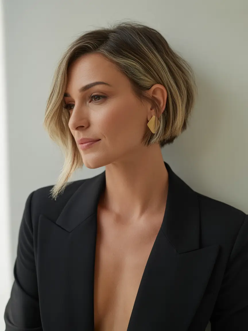 A minimalist bob has a silent sophistication. Shaved short and rough at the very base of the jaw, it adds structure to the shape and appears casual even with the simplest of basics. In women who are above 40, this type of clean, sharp cut sends subtle confidence.