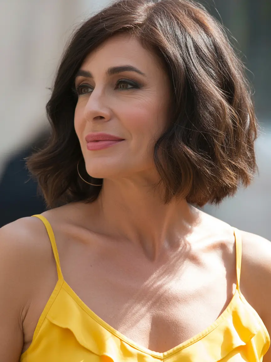 This professional and slightly accented mid-length version is the best strike of professional and accessibleness. The slightly tapered ends shape it, and the highlights on the face, which have been placed by the sun, make the whole brunette base warm. In women who have passed the 40 years of age, the haircut is a beauty frame to the face- elegant but never harsh.