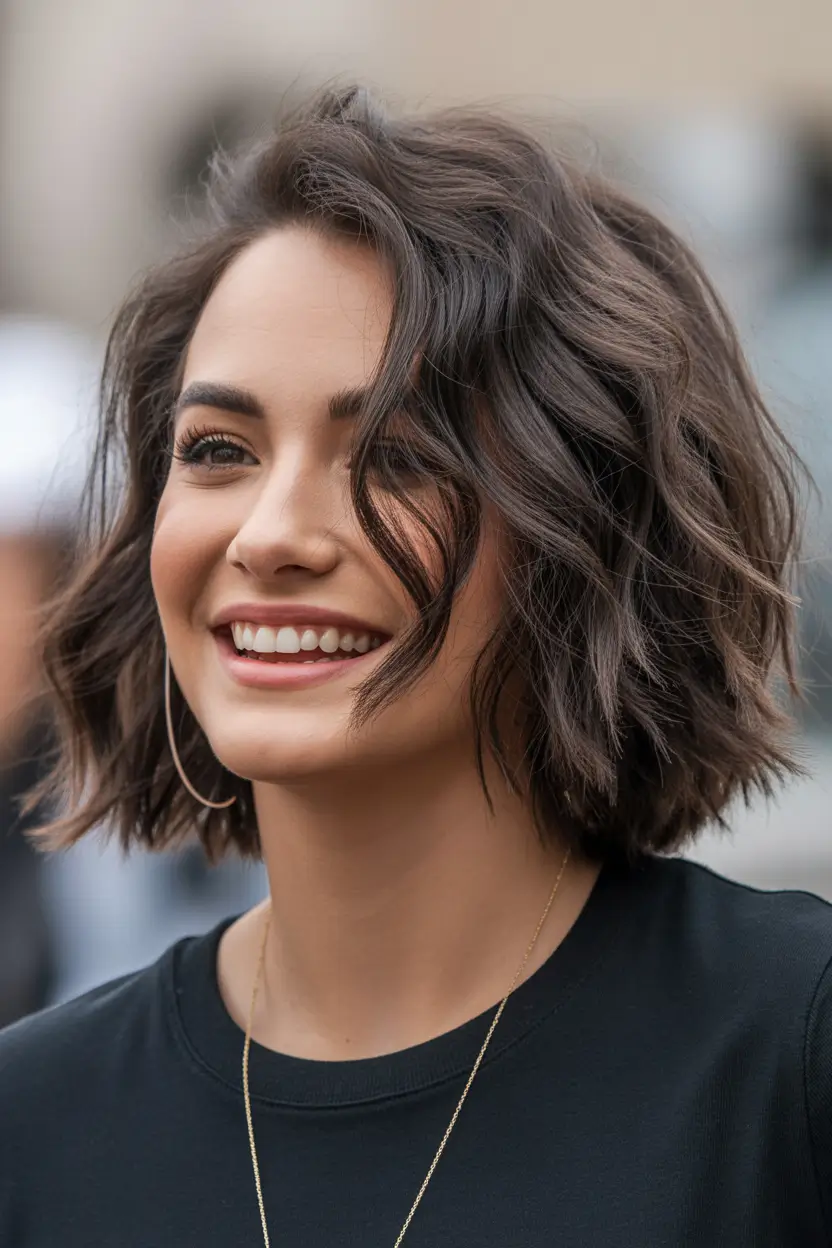 Softly layered round bob adds an immediate volume at the top which is particularly flattering in colder seasons when hats straighten the hair. The dimensional brunette adds depth and light, and attracts the attention at any angle.