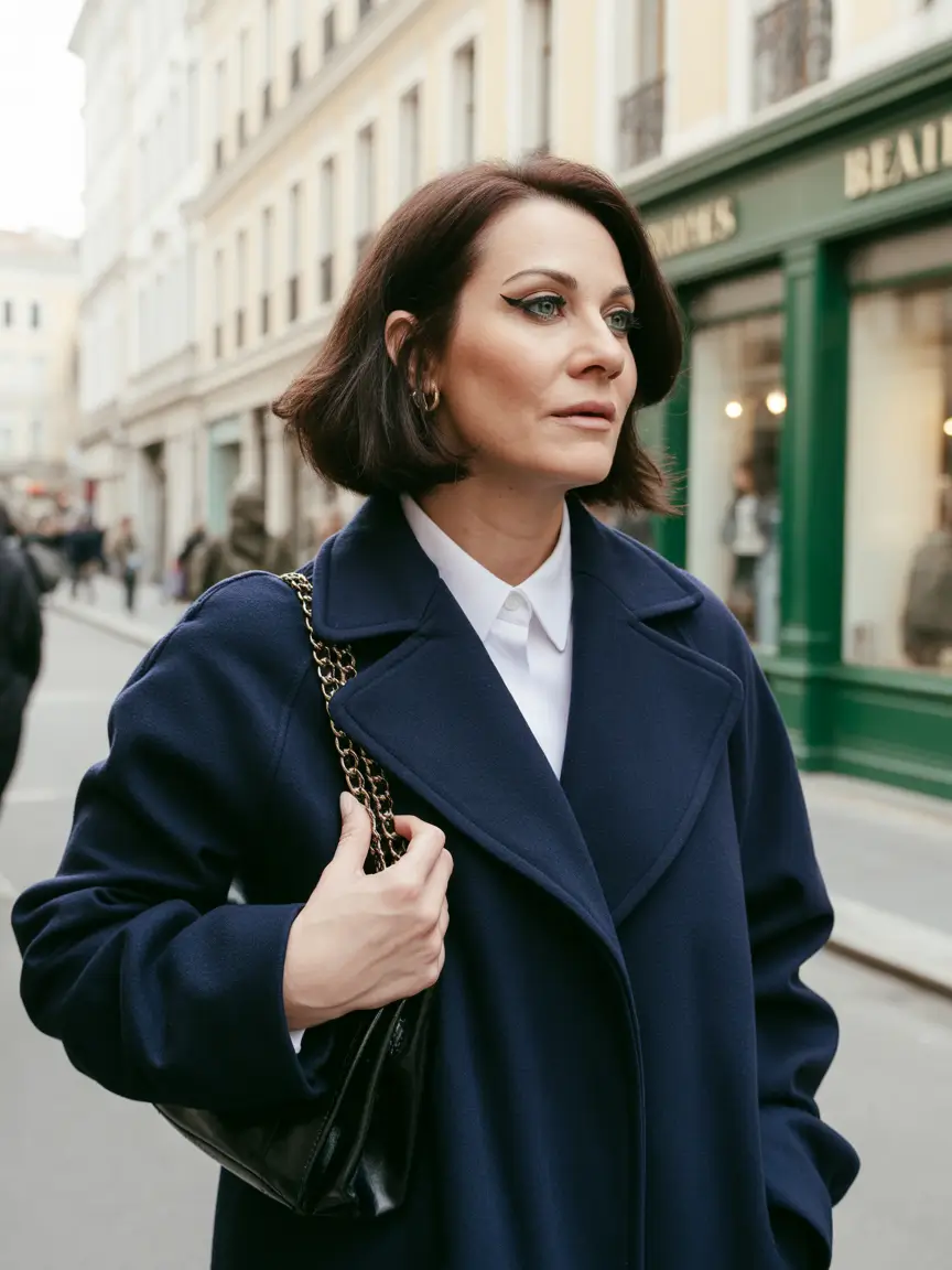 The combination of traditional and modern is what I adore in this. It is not trying too hard to be trendy, yet it is style forward, particularly with winter coats and bright makeup.