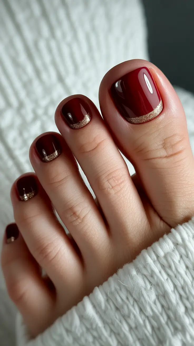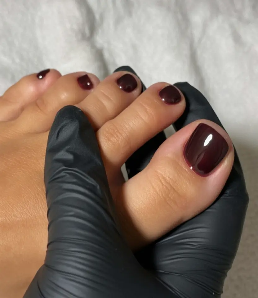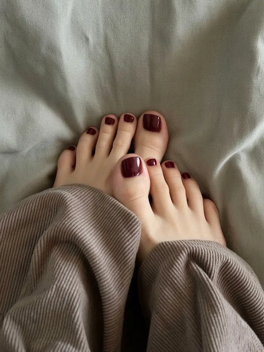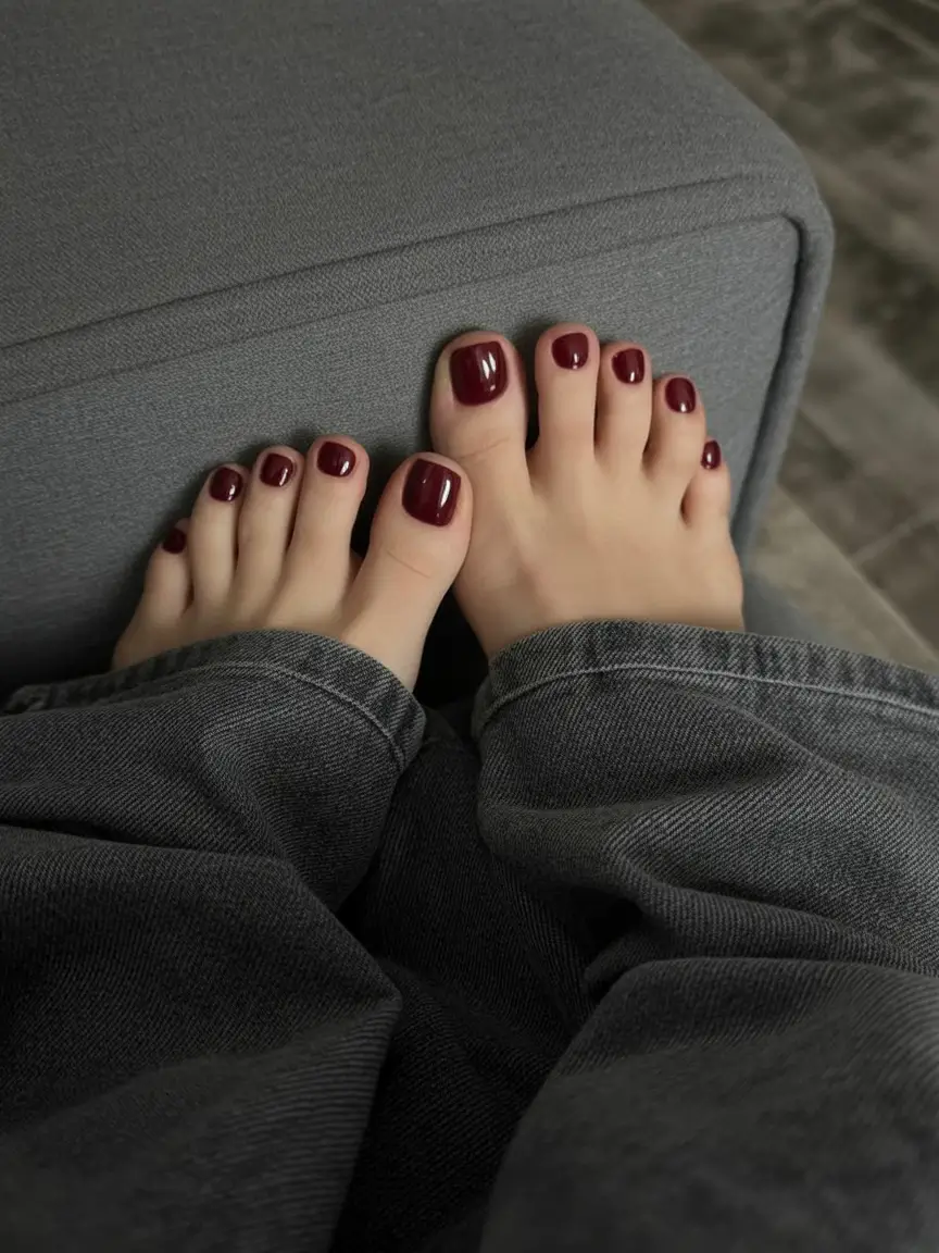 This is a deeper, more wine-like garnet tinge of color – red velvet under the candlelight. It is among my preferred winter toe nails looks since it fits perfectly well with the appearances we enjoy in the season: suede, wool, and leather. It becomes planned, designed, and slightly sensual when the burgundy heels or boots are worn with it.
