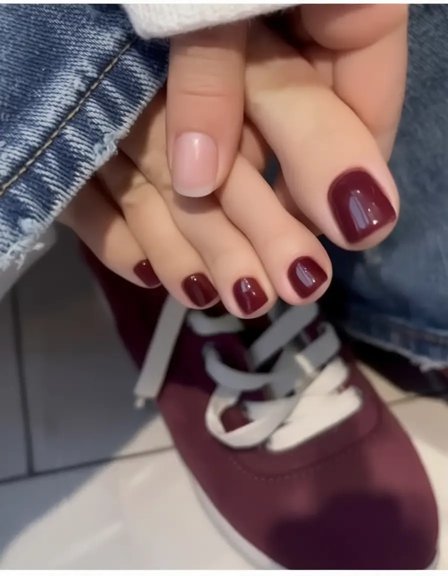 This rich burgundy pedicure with sneakers is all that one needs, a casual but elegant, childish yet adult treat. It embodies that street chic that is redefining winter nails toes shades in 2025-2026. The color is in between the berry and wine shades and this makes it rich enough to be worn during winter, but at the same time flexible in that it can be worn on everyday basis.
