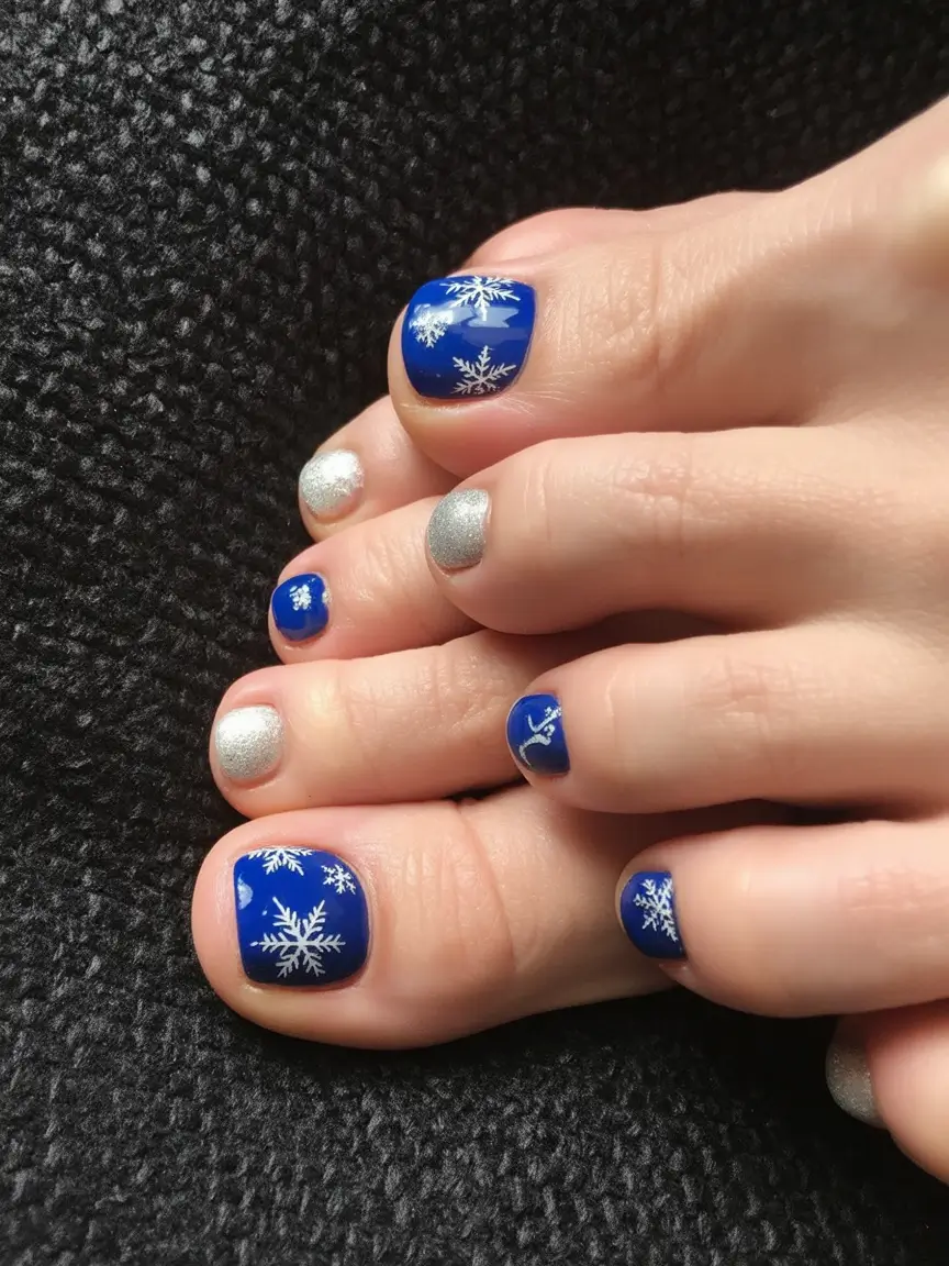 Winter can never be winter minus some magic and this snowflake-themed design embodies it all. The blend of silver and icy blue sparkle is cool and gladdening, similar to the initial frost of the winter season in December. It is the type of manicure, which immediately improves your mood, making your feet a miniature festival of the season.
