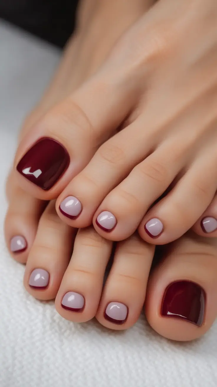 It is slightly mischievous to combine plum and nude in a pairing, so classy and surprising at the same time. The burgundy is so deep and so moody with the winter, but the neutral color is so soft and balancing. It is sophisticated, yet non-traditional, the type of pedicure that makes you feel as though you are having a designer secret underneath your shoes.