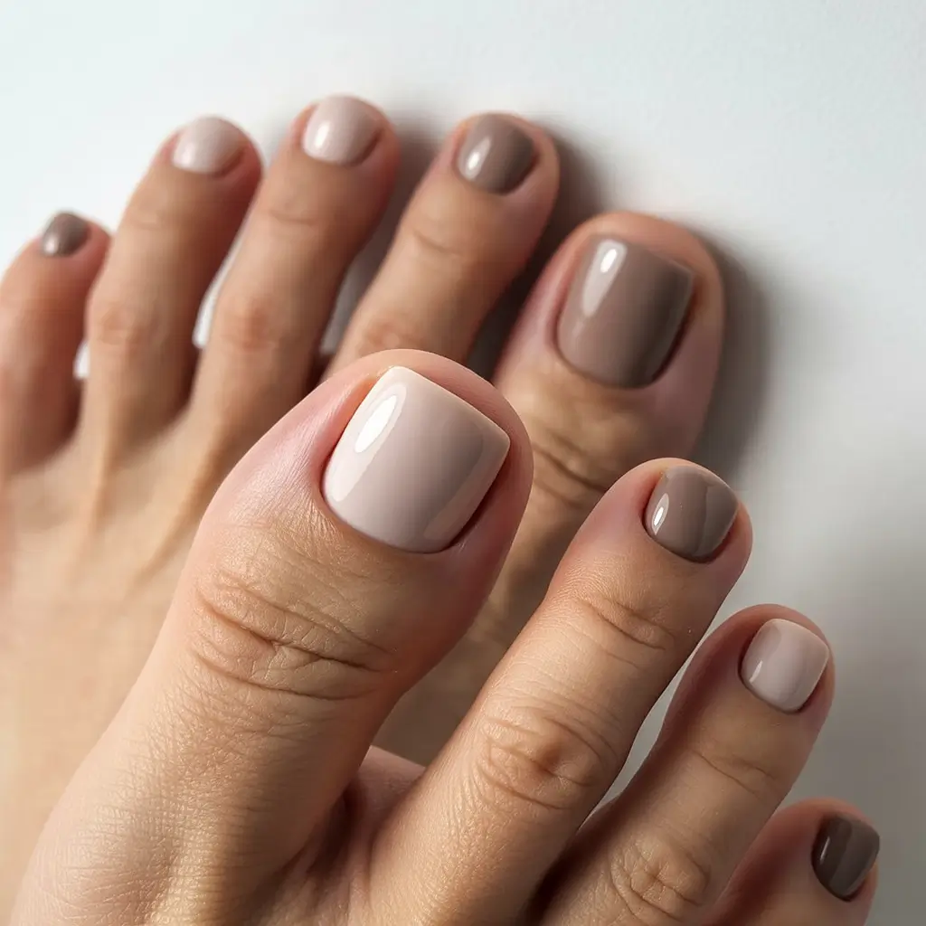 To achieve such an appearance, I would suggest to use Dior Vernis, shade Grereg on the light part and OPI, shade Taupe-less Beach on the deeper part. You may take them one toe at a time in rotation or use conker hue on the large toes only to bring about a balance. Apply a shiny topcoat such as Sally Hansen Insta-Dri to that glass-like finish.